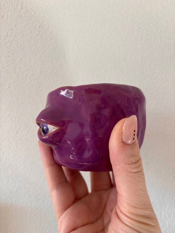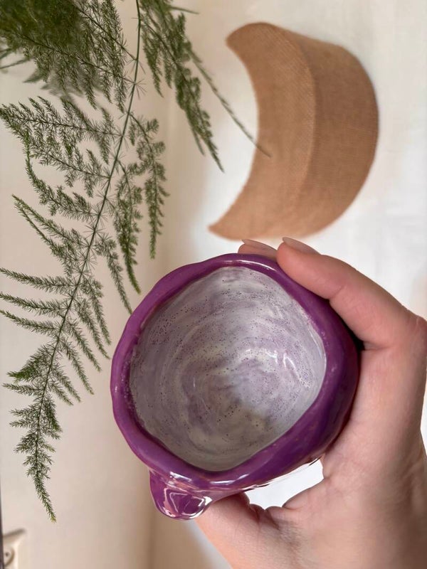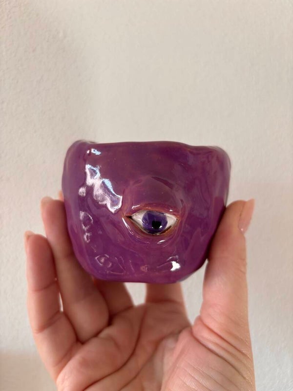 Een klein handgemaakt keramieken kopje met een mysterieuze uitstraling. De glanzende paarse glazuur en het oog in het midden maken dit stuk meteen een blikvanger. Het lijkt bijna alsof het kopje je rustig aankijkt. Een speels, een beetje magisch object dat perfect past bij een interieur met karakter.