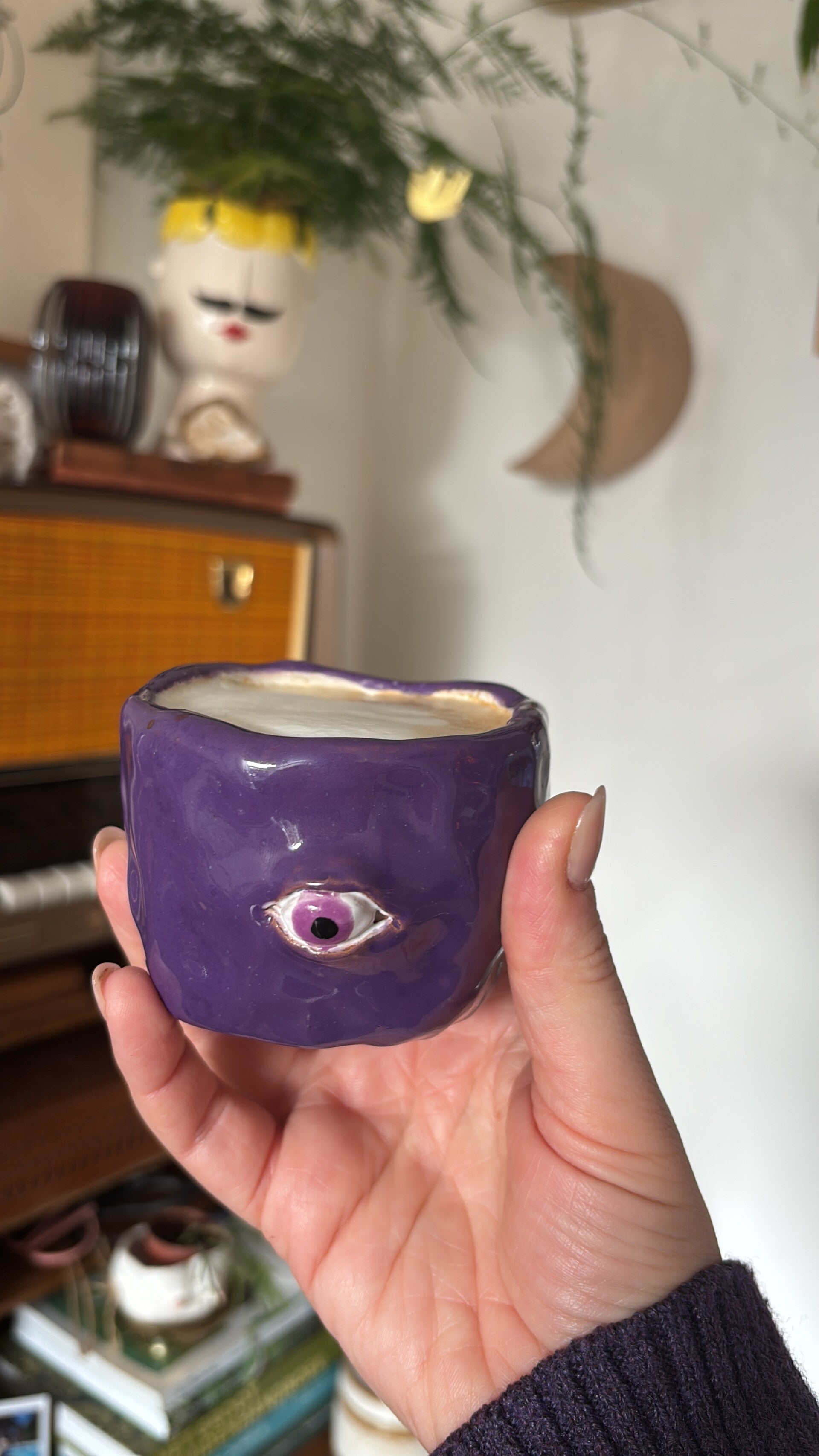 Een klein handgemaakt keramieken kopje met een mysterieuze uitstraling. De glanzende paarse glazuur en het oog in het midden maken dit stuk meteen een blikvanger. Het lijkt bijna alsof het kopje je rustig aankijkt. Een speels, een beetje magisch object dat perfect past bij een interieur met karakter.