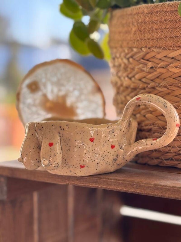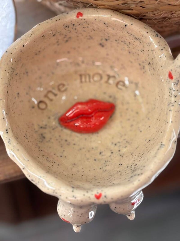 Start je dag met een glimlach! Deze handgemaakte keramische mok heeft binnenin de tekst “One More” met rode lippen, perfect voor een vrolijke knipoog bij je koffie of soep. Aan de buitenkant pronken twee flinke boobies, met een kleurrijk spikkelglazuur, waardoor elke slok nét dat beetje extra plezier geeft. Een uniek en ondeugend cadeau voor jezelf of een vriend of vriendin die van humor houdt.